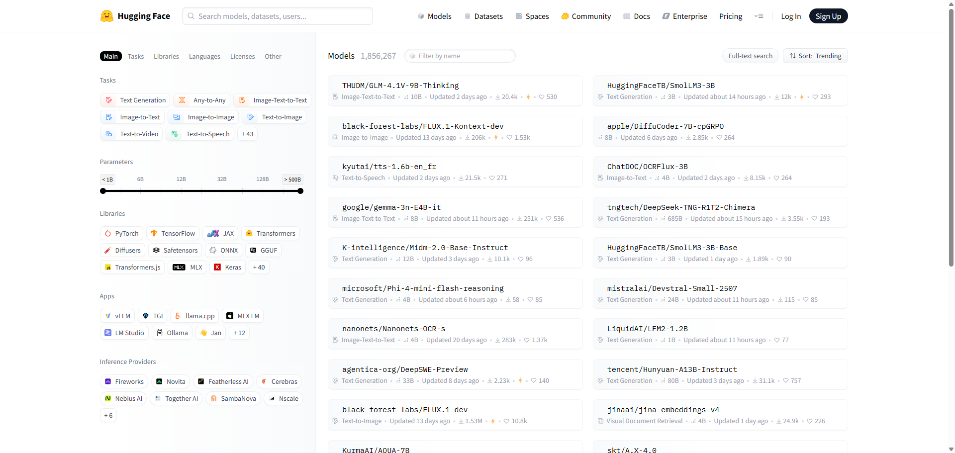 Hugging Face其实我更愿意称它为是一个社区。它不仅提供API来简化预训练机器学习模型的访问和使用,更重要的是,它建立了一个强大的社区,让研究人员、数据科学家和开发者能够共享数据集、模型和应用程序,共同推动AI技术的发展。很多新的模型你都可以在hugginface上找到。