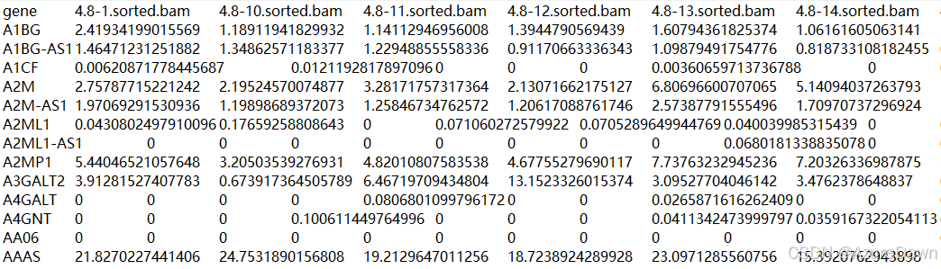 第1列为基因名,第2列为Sample1对应的tpm数,第3列为Sample2对应的tpm数,以此类推。