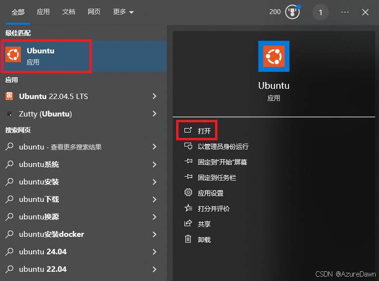 在开始菜单的搜索中输入ubuntu,即可打开Ubuntu。