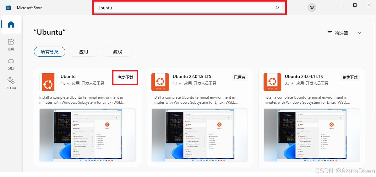 开始菜单旁“搜索”按钮,查找“app”并打开“Microsoft Store”,搜索“Ubuntu”,选择“Ubuntu”。点击免费下载并安装。