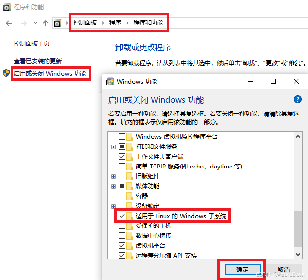 Win10开始菜单旁“搜索”按钮,查找“控制面板”并打开,选择”程序” —— “程序与功能”子页面,点击“启用或关闭Windows功能”,托动滚动条至最低部,勾远“适用于Linux的Windows子系统” ,再点击“确定”。