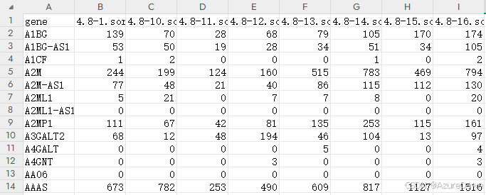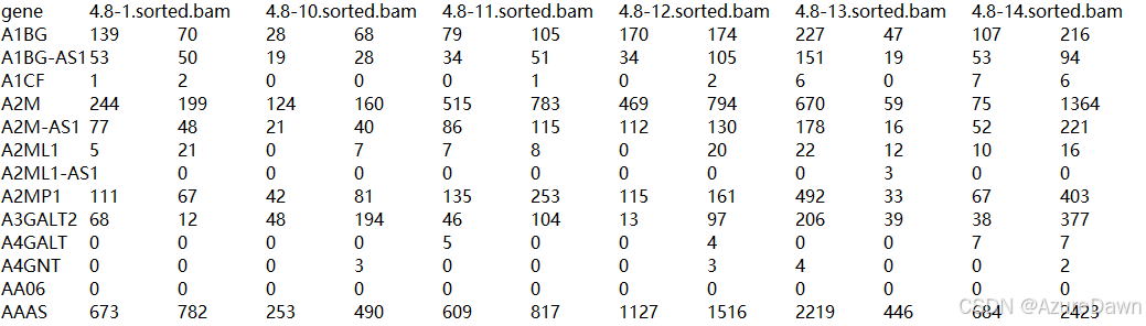 第1列为基因名,第2列为Sample1对应的count数,第3列为Sample2对应的count数,以此类推。