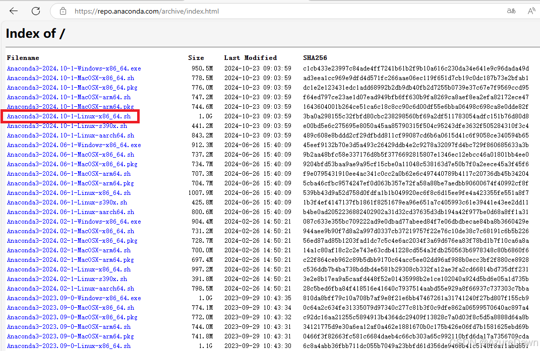根据自己的需要下载版本,我这里下载的是 Anaconda3-2024.10-1-Linux-x86_64.sh