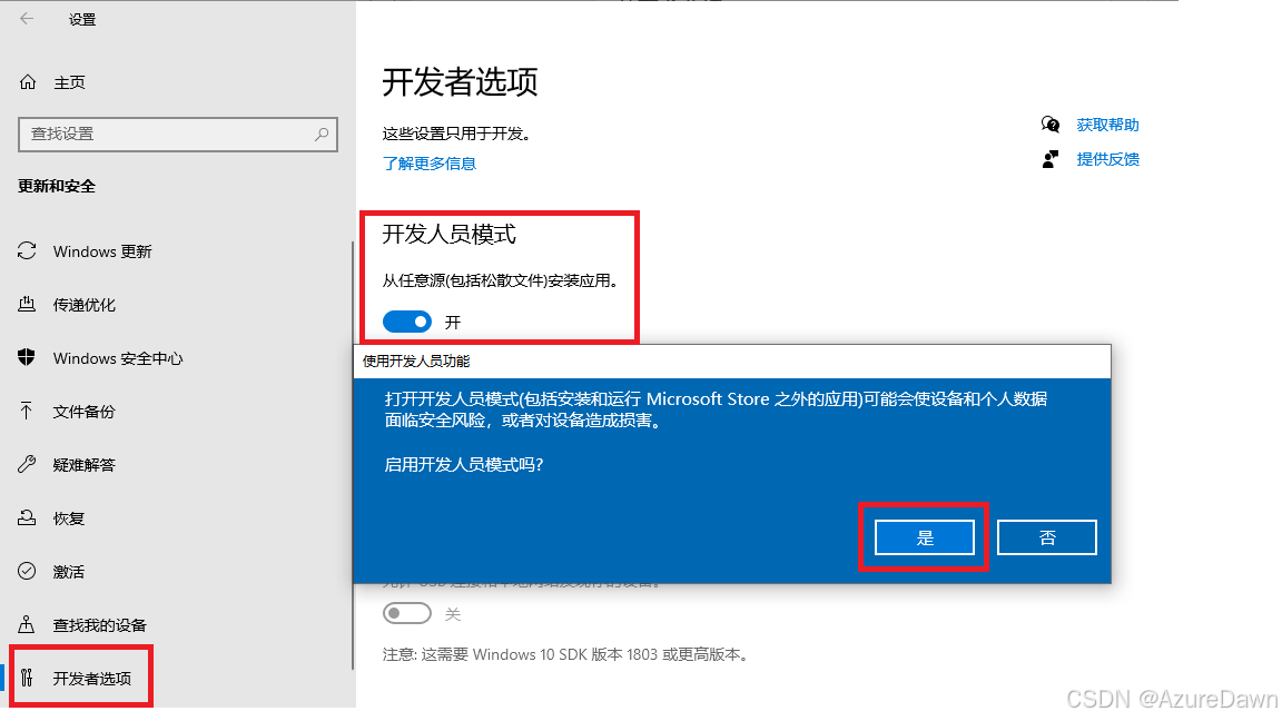 同一个页面,左侧选择“开发者选项” —— 切换至“开发人员模式”,点击“是”确认,会自动安装开发人员模式程序包,并启动桌面远程工具等。