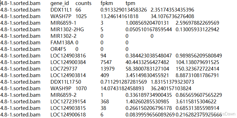 第一列为样品名;第二列为基因名;第三列为counts数;第四列为fpkm值;第五列为tpm值