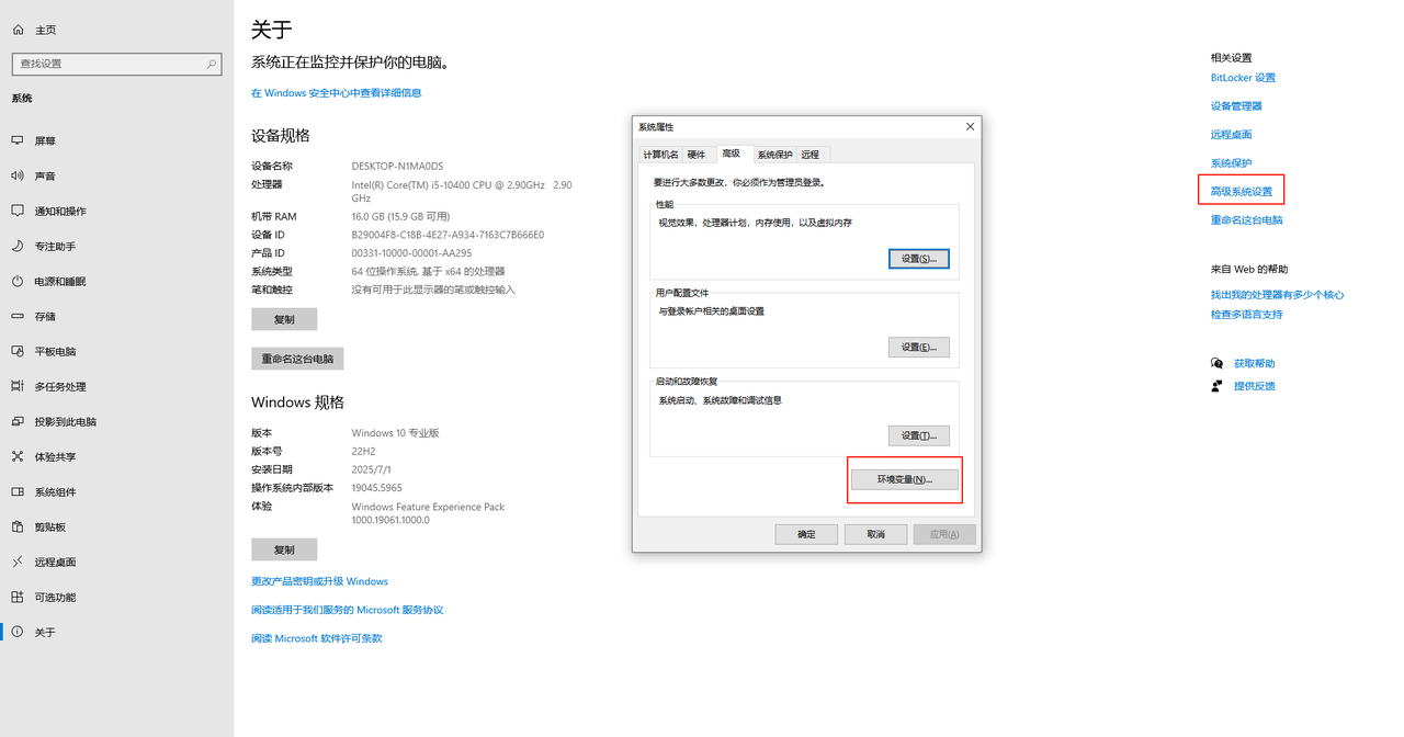 路径:设置-->系统-->关于(右上角)-->高级系统设置-->环境变量