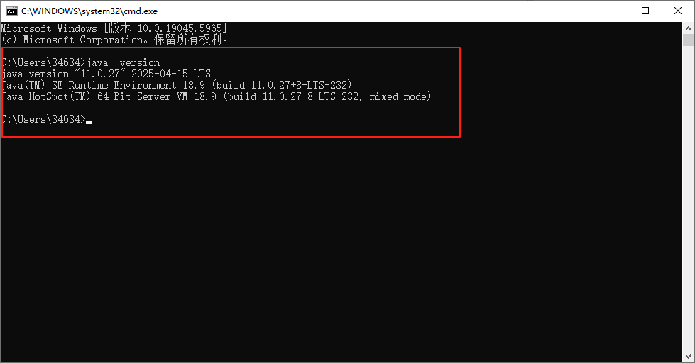 使用快捷键 “win + R”,输入 “cmd” 打开命令行窗口,然后输入 “java -version” 查看当前 JDK 版本信息(我这边显示的是 “11”,因为我上面配置的是11)