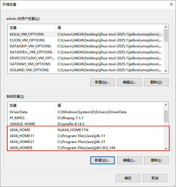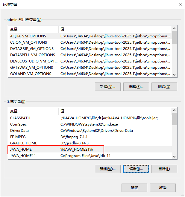 修改通用的 “JAVA_HOME” 的值(修改成你配置好且需要的版本)