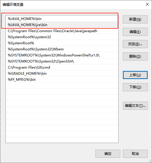在 “path” 环境变量中添加这两条配置,并将它们移动到最上方(否则可能无法切换版本)