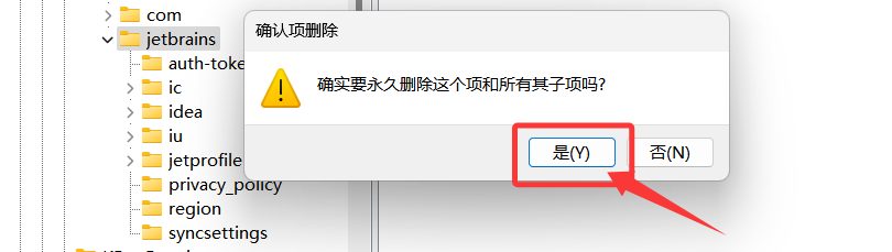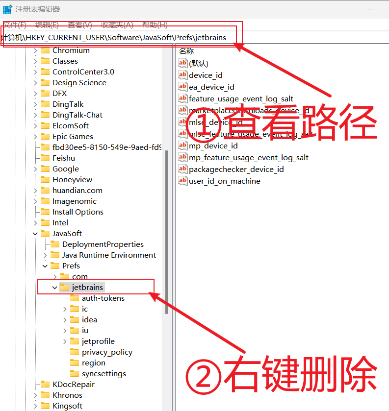 打开注册表,根据目录:计算机\\HKEY_CURRENT_USER\\SOFTWARE\\JavaSoft\\Prefs\\jetbrains删除jetbrains