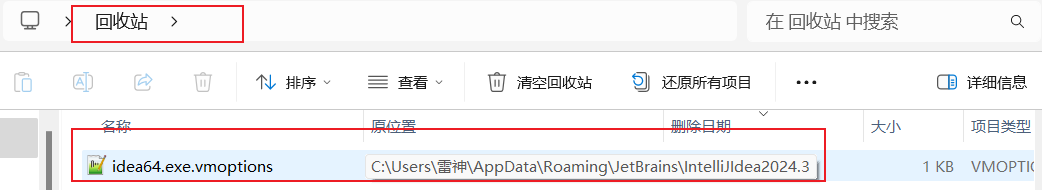 “Cannot start the IDE Cannot collect JVM options Caused by: 0: Cannot read: \"C:1VUsers\\\\雷神 \\AppData\\\\Roaming\\UetBrains\\WntelliJIdea2024.3\\Videa64.exe .vmoptions\" 1: stream did not contain valid UTF-8 Please try to reinstall the IDE. For support, plea”