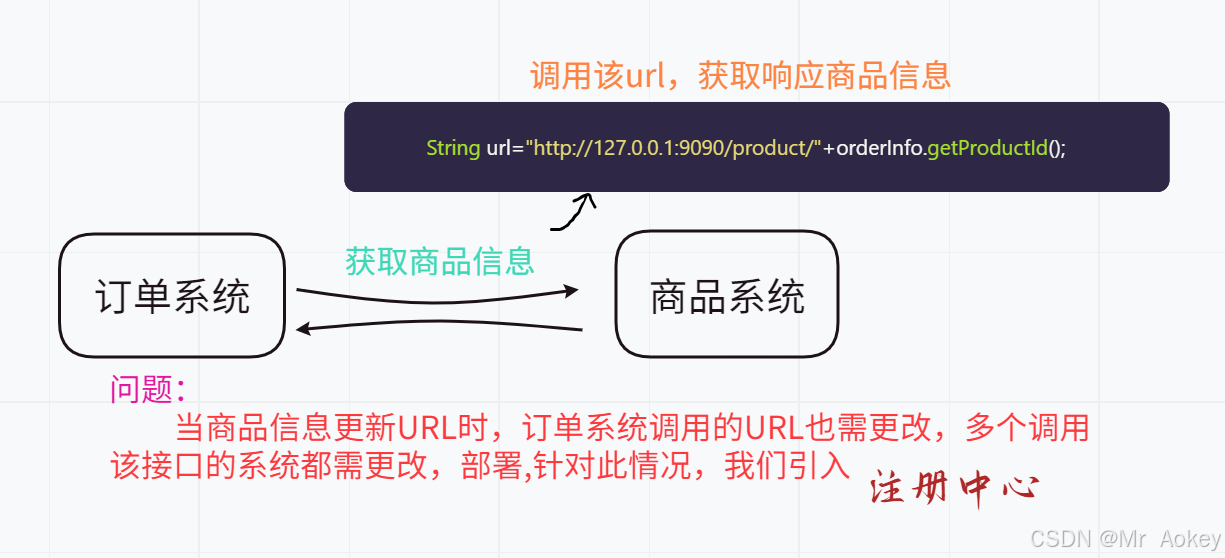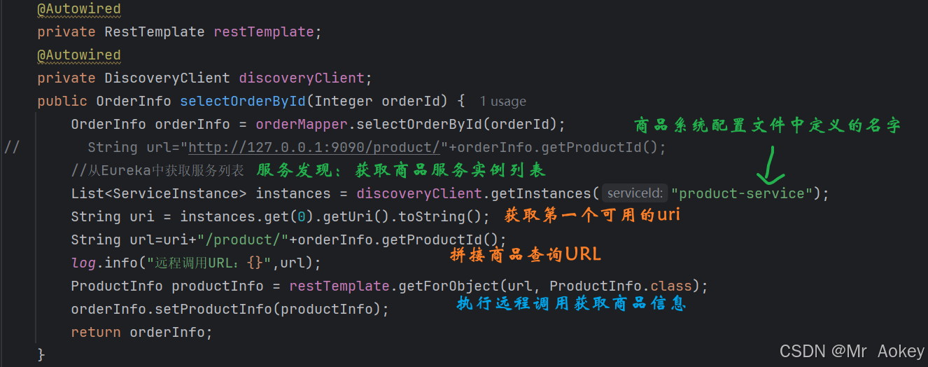 @Slf4j@Servicepublic class OrderService { @Autowired private OrderMapper orderMapper; @Autowired private RestTemplate restTemplate; @Autowired private DiscoveryClient discoveryClient; public OrderInfo selectOrderById(Integer orderId) { OrderInfo orderInfo = orderMapper.selectOrderById(orderId);// String url=\"http://127.0.0.1:9090/product/\"+orderInfo.getProductId(); //从Eureka中获取服务列表 List instances = discoveryClient.getInstances(\"product-service\"); String uri = instances.get(0).getUri().toString(); String url=uri+\"/product/\"+orderInfo.getProductId(); log.info(\"远程调用URL:{}\",url); ProductInfo productInfo = restTemplate.getForObject(url, ProductInfo.class); orderInfo.setProductInfo(productInfo); return orderInfo; }}