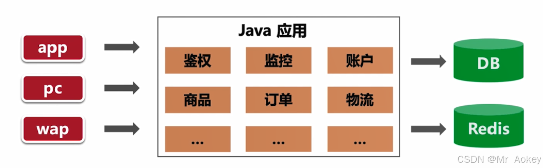 本文将介绍微服务架构。在此之前,我们采用的都是单体架构模式,即将前端、后端和数据库等所有功能模块都打包在同一个项目中,最终生成单个 war 包或 jar 包,这种架构方式就被称为单体架构