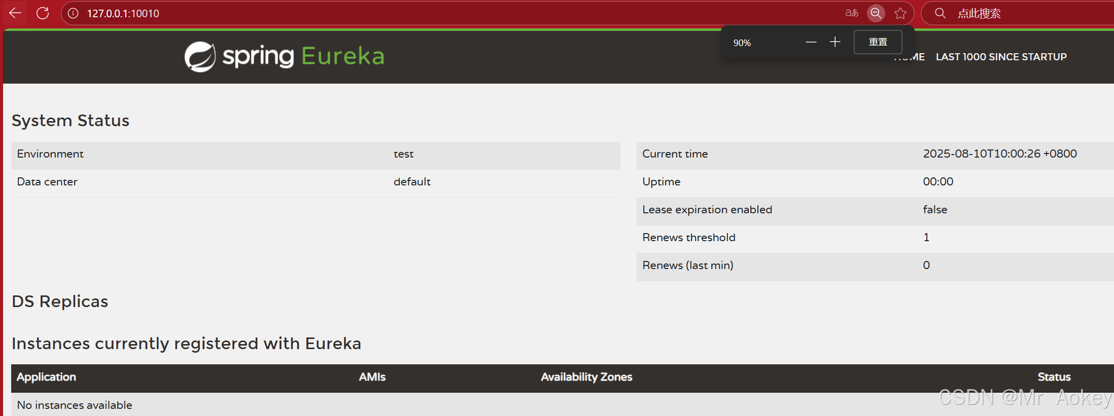 运行该程序,并访问http://127.0.0.1:10010/ 观察到下图,证明Eureka注册中心搭建完成!