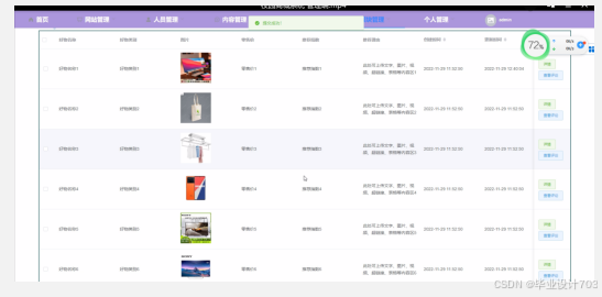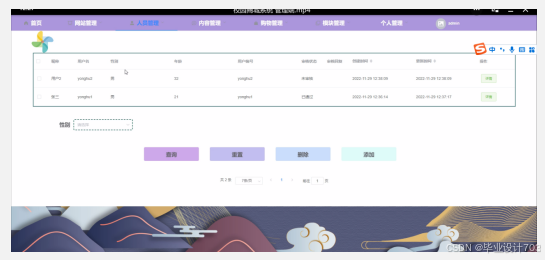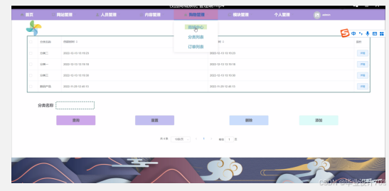 在管理员功能页面可以查看首页、网站管理(轮播图、公告栏)人员管理(管理员、注册用户)内容管理(商城资讯、资讯分类)购物管理(商城中心、分类列表、订单列表)、模块管理(好物分类、商城好物、订单售后)个人管理、系统管理等内容进行相对应操作,如图5-10所示。