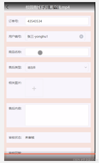 订单售后,在订单售后页面通过填写订单号、用户编号、商品名称、售后类型、相关图片、售后内容、审核状态、审核回复等信息并提交,如图5-8所示。