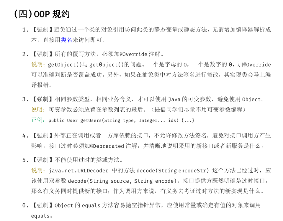 - OOP 规约:所有的覆写方法必须加 @Override 注解,这不仅能明确标识方法的重写关系,还能避免因方法签名错误导致的意外情况;在使用 Object 的 equals 方法时,应使用常量或确定有值的对象来调用 equals,防止空指针异常,例如 “\"hello\".equals (str)”;所有整型包装类对象之间值的比较,全部使用 equals 方法比较,避免因自动装箱和拆箱导致的潜在问题,确保代码在不同环境下的一致性和稳定性。