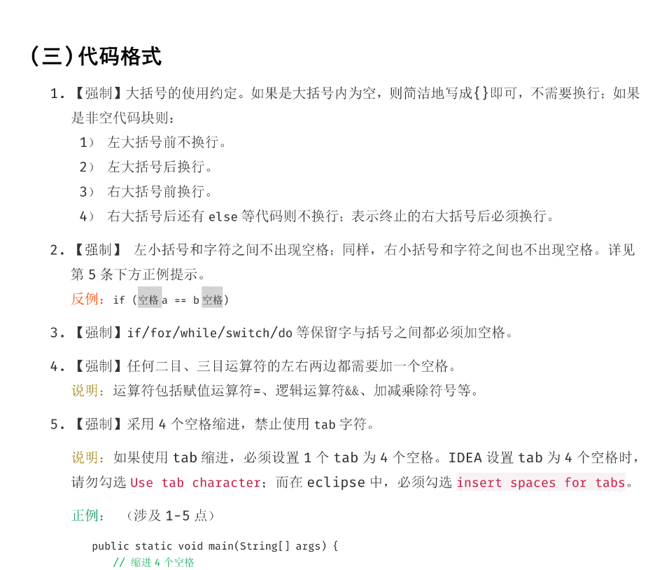 - 代码格式:规定采用 4 个空格缩进,禁止使用 Tab 字符,以保证在不同开发环境下代码格式的一致性;注释的双斜线与注释内容之间有且仅有一个空格,增强注释的规范性和可读性;对单行字符数进行限制,不超过 120 个,超出时需按照特定的换行原则进行换行,如运算符与下文一起换行、方法调用的点符号与下文一起换行等,使代码排版更加整洁美观,易于阅读和维护。