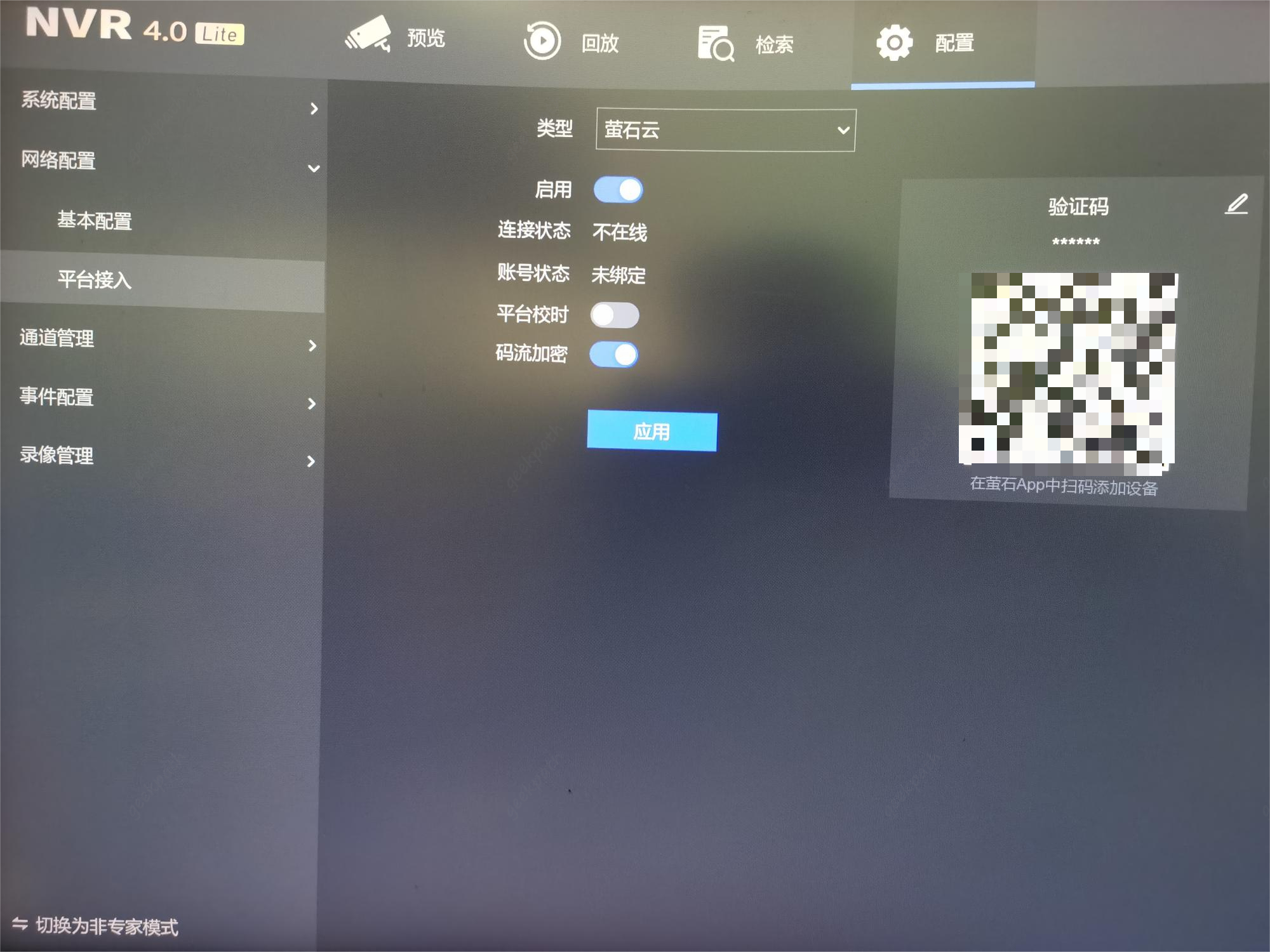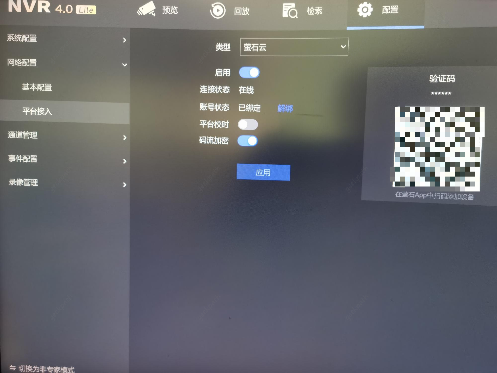 录像机二维码查看:配置 > 网络配置 > 平台接入 的右侧可查看。该方式可以通过点击二维码右上角图标自行设置验证码