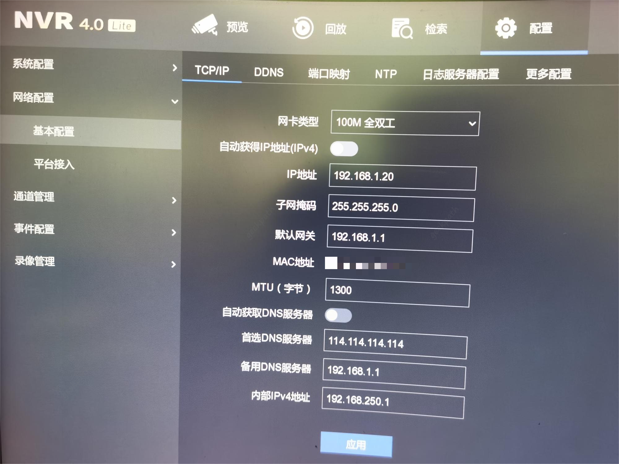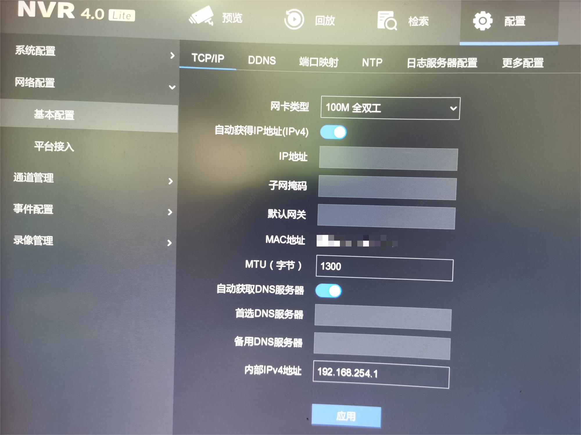 如果你的路由器开启了DHCP自动分配IP地址,录像机也可以采用自动获取IP地址和自动获取DNS服务器的方式。其他参数保持默认,其中“内部IPv4地址”指的是连接在录像机上摄像头的IP网段,可以理解为录像机以该网段进行DHCP自动分配IP给摄像头。