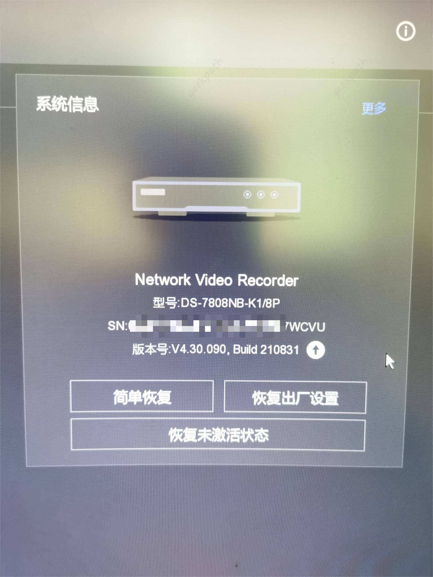 录像机序列号查看:主页面右上角感叹号(维护)查看, 序列号WCVU之前的9位为录像机验证码。
