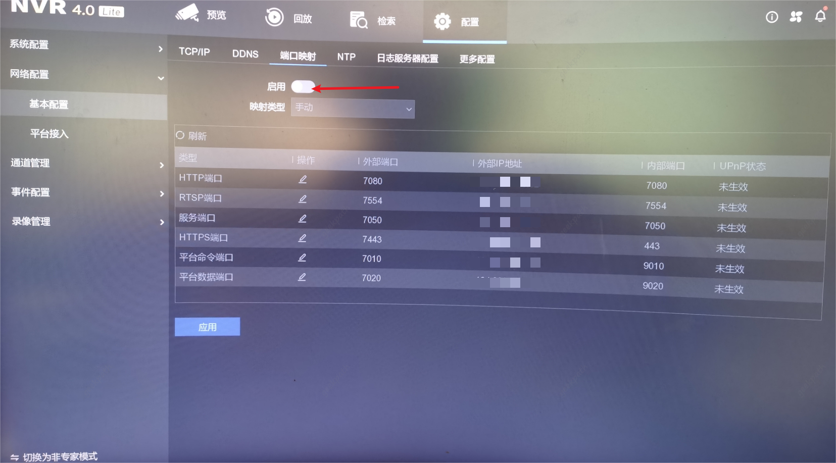 该监控录像机系统内置端口转发,无需依赖路由器进行端口转发(仍需拥有公网IP),只需要直接点击“启用”即可,就能将该监控录像机的相应端口开启。该方式可以更为自由,更为多样化地访问和管理监控录像机,如果不想仅仅局限于萤石云视频应用程序中的功能,想作为超级管理员,更专业地管理录像机上的多个监控设备可以采用该方式。
