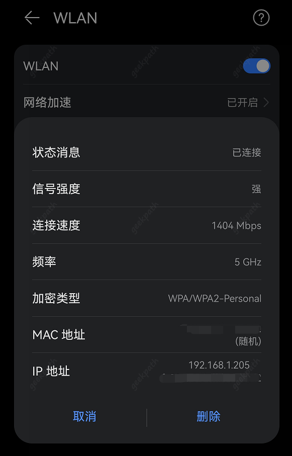IP地址设置:看你家路由器设置的内部网络的IP网段来设置,不会查看路由器,可以直接查看你手机现在连接的WIFI的IP地址(别说你是蹭别人家WIFI的哈)。例如下图查看到手机IP为“192.168.1.205”,那么你的网段就是“192.168.1.x”,你可以将“192.168.1.1 ~ 192.168.1.254”中没有被分配且不是路由器DHCP范围之内的IP地址配置给该录像机。