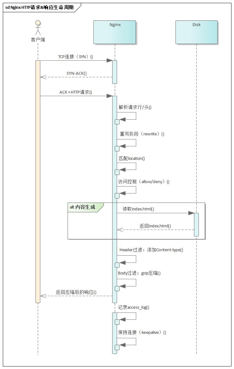 Nginx处理一个HTTP请求并生成响应的全生命周期是一个高度模块化、事件驱动、非阻塞 I/O的复杂过程。从TCP连接建立,到HTTP请求解析、模块链处理(重写、访问控制、内容生成、过滤),再到响应发送与连接回收,每个阶段都由特定模块按顺序执行,通过非阻塞I/O和进程模型(多worker)实现高并发处理。以下是一个简单的index.html请求响应流程: