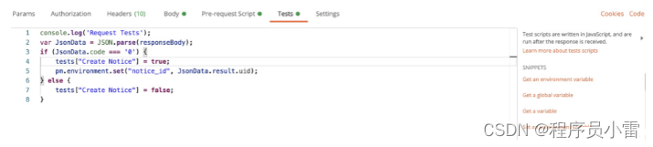 这里就需要用到Postman请求脚本(Pre-request Script)和测试脚本(Tests Script)。