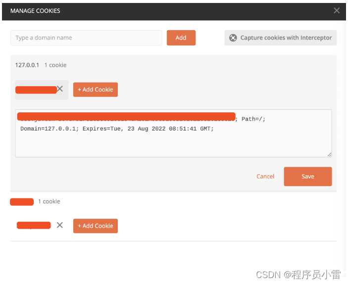 除了环境设置,有时候接口可能还接了第三方统一登录,需要设置Cookie值。这个可以在单个接口的header上设置,不过一般都放在全局去做。在Save按钮的底下有行写着Cookie橙色的小字,点开之后就能进行设置。