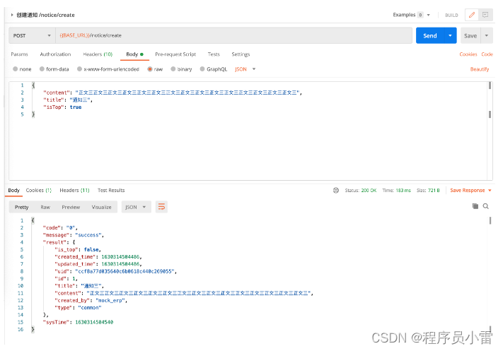 基本思路其实还是设置环境变量。比如展示通知接口(/notice/show/:id)依赖创建通知接口(/notice/create),可以把展示通知接口的URL改为{{BASE_URL}}/notice/show/{{notice_id}},只要设置notice_id,就可以调用不同的ID了。区别在于,上面使用的BASE_URL的值是一个确定的常量,而notice_id是随着创建接口动态变化的值,如何动态设置环境变量是关键。