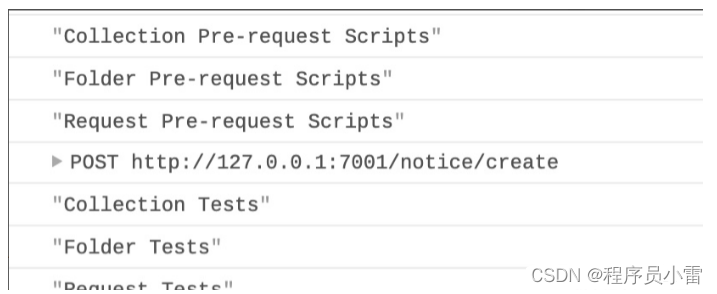不光是请求(Request)可以设置脚本,集合(Collection)和文件夹(Folder)也能设置脚本,并且它们的脚本可以在内部的所有请求中生效。笔者用console.log测试了这几者的执行顺序,结果如下: