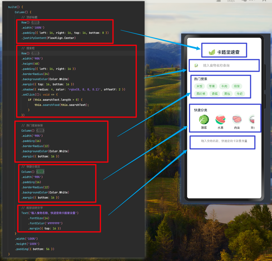 下图展示了我们将要实现的食物卡路里查询应用界面。整个界面是通过组件化方式构建的,主要包含搜索框、热门搜索标签和快捷分类区域。这些UI元素都封装在一个可复用的SearchHeader