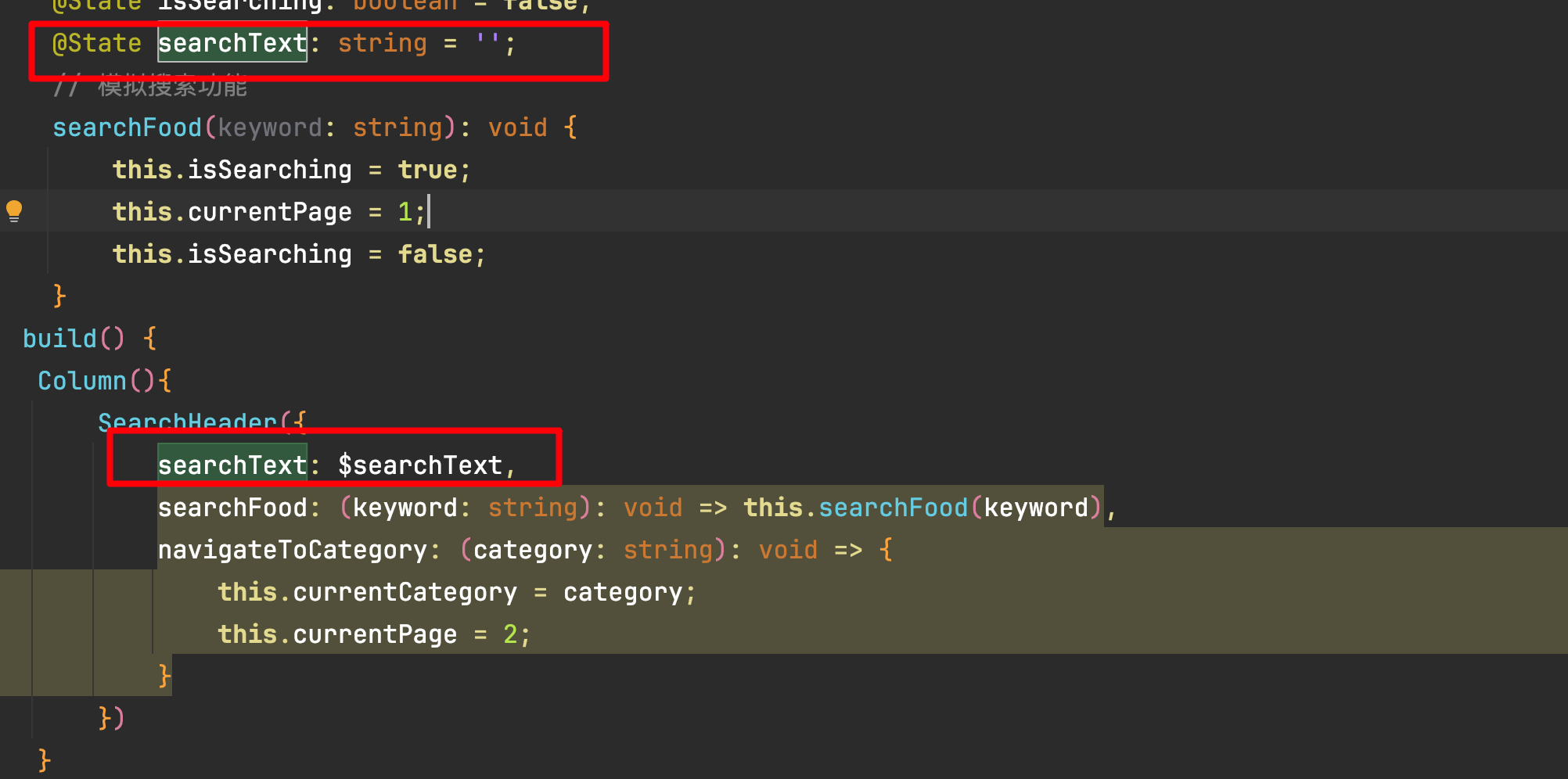 // 使用@Link装饰器创建双向数据绑定@Link searchText: string;// 定义函数类型的属性,用于接收父组件传递的方法private searchFood: (keyword: string) => void = () => {};private navigateToCategory: (category: string) => void = () => {};
