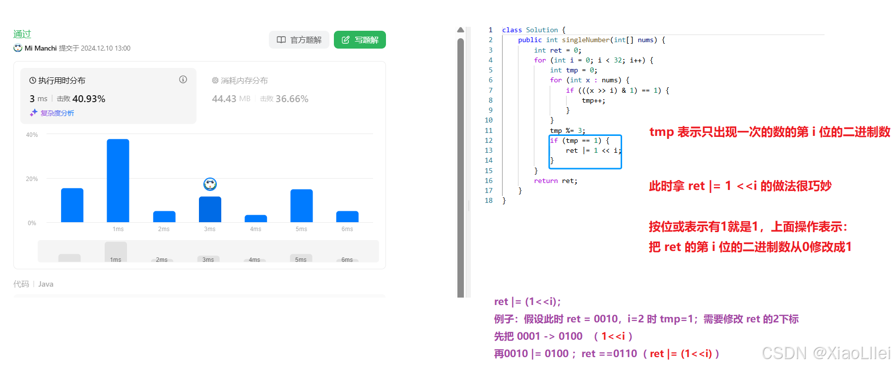 我们发现,圈起来的数字,前后一 一对应 ;左边圈起来的数,表示只出现一次的那一个比特位,这个比特位,与四个比特位之和%3得到的结果相等;