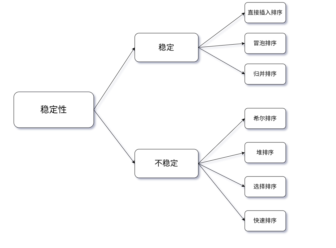 稳定性:如果在一个待排序的序列中,有多个相同的元素,经过各种排序方法排序后,该相同元素的相对位置没有发生改变,则称该排序算法是稳定的,反正,则为不稳定。
