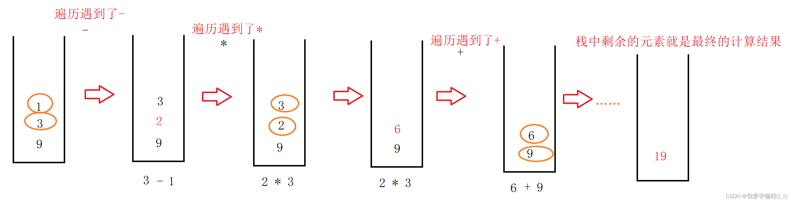 class Solution { public int evalRPN(String[] tokens) { Stack stack = new Stack(); // 遍历字符串数组 for (int i = 0; i < tokens.length; i++) { // 判断这个字符串是否为数字 // 数字难判断,但运算符很简单,因此可以转换角度来判断运算符 if (!isOperator(tokens[i])) { // 是数字就入栈 stack.push(tokens[i]); } else { // 开始运算 int y = Integer.parseInt(stack.pop()); // 右操作数 int x = Integer.parseInt(stack.pop()); // 左操作数 int result = 0; switch (tokens[i]) { case \"+\" : result = x+y; break; case \"-\" : result = x-y; break; case \"*\" : result = x*y; break; case \"/\" : result = x/y; break; } // 运算完的结果返回到栈中 Integer j = result; stack.push(j.toString()); } } // 返回栈中最后剩余的元素 return Integer.parseInt(stack.pop()); } private boolean isOperator(String s) { // 如果不是+、-、*、/,那就是数字字符 return s.equals(\"+\") || s.equals(\"-\") || s.equals(\"*\") || s.equals(\"/\"); }}