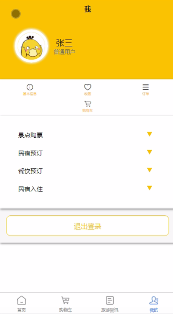 用户点击右下角“我的”进入个人账户首页,功能包话:基本信息、收藏、购物车、订单、景点购票、民宿预订、餐饮预计、民宿入住功能。界面如下图4-4所示。