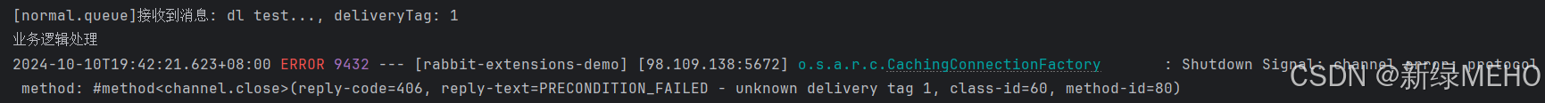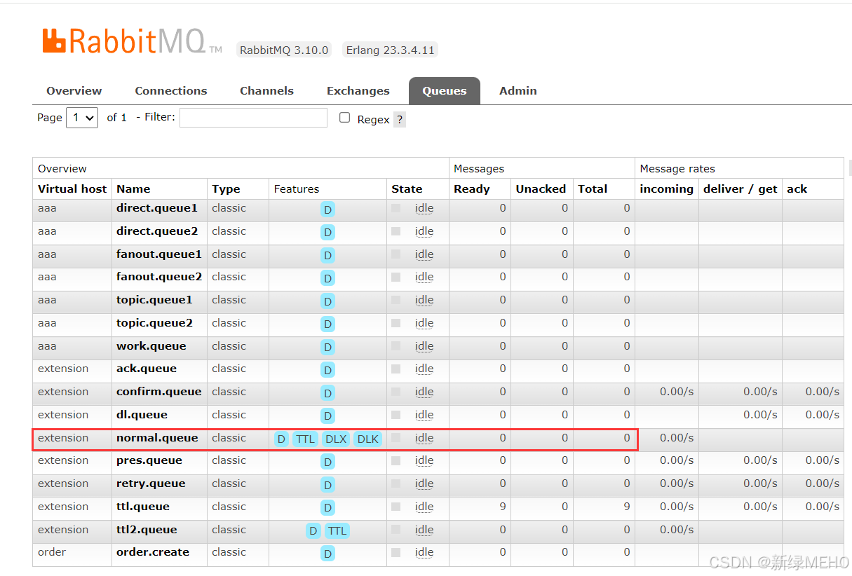 可以看到,normal队列中的消息在被消费时因为发生了异常而执行到了拒绝消息的代码,而且设置了消息不重新入队,导致消息变成了死信,进而进入到了死信队列。
