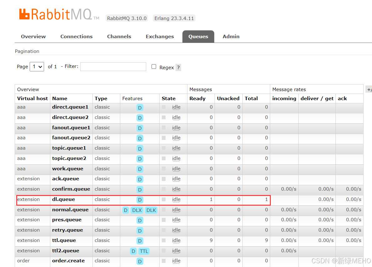 此时我们可以看到,给队列设置了最大长度为10,但是队列接收到了20条消息,就会导致前10条消息变成死信。