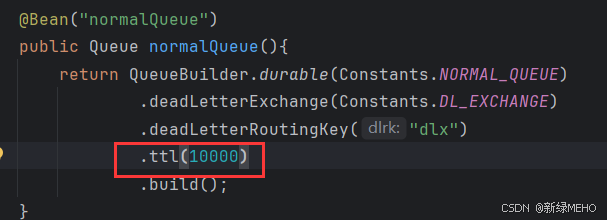 import org.springframework.amqp.core.*;import org.springframework.beans.factory.annotation.Qualifier;import org.springframework.context.annotation.Bean;import org.springframework.context.annotation.Configuration;import rabbitextensionsdemo.constant.Constants;@Configurationpublic class DLConfig { //正常的交换机和队列 @Bean(\"normalQueue\") public Queue normalQueue(){ return QueueBuilder.durable(Constants.NORMAL_QUEUE) .deadLetterExchange(Constants.DL_EXCHANGE) .deadLetterRoutingKey(\"dlx\") .build(); } @Bean(\"normalExchange\") public DirectExchange normalExchange(){ return ExchangeBuilder.directExchange(Constants.NORMAL_EXCHANGE).build(); } @Bean(\"normalBinding\") public Binding normalBinding(@Qualifier(\"normalQueue\") Queue queue, @Qualifier(\"normalExchange\") Exchange exchange){ return BindingBuilder.bind(queue).to(exchange).with(\"normal\").noargs(); } //死信交换机和队列 @Bean(\"dlQueue\") public Queue dlQueue(){ return QueueBuilder.durable(Constants.DL_QUEUE).build(); } @Bean(\"dlExchange\") public DirectExchange dlExchange(){ return ExchangeBuilder.directExchange(Constants.DL_EXCHANGE).build(); } @Bean(\"dlBinding\") public Binding dlBinding(@Qualifier(\"dlQueue\") Queue queue, @Qualifier(\"dlExchange\") Exchange exchange){ return BindingBuilder.bind(queue).to(exchange).with(\"dlx\").noargs(); }}