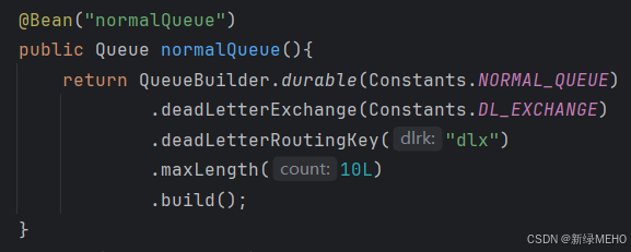 public class Constants { //死信 public static final String NORMAL_QUEUE = \"normal.queue\"; public static final String NORMAL_EXCHANGE = \"normal.exchange\"; public static final String DL_QUEUE = \"dl.queue\"; public static final String DL_EXCHANGE= \"dl.exchange\";}