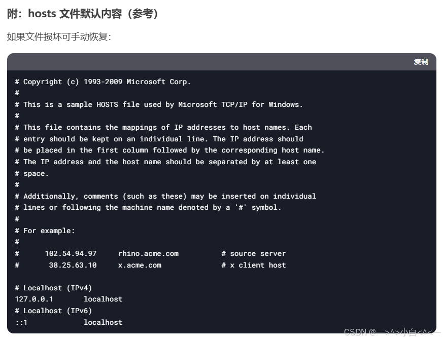 ## Copyright (c) 1993-2009 Microsoft Corp.## This is a sample HOSTS file used by Microsoft TCP/IP for Windows.## This file contains the mappings of IP addresses to host names. Each# entry should be kept on an individual line. The IP address should# be placed in the first column followed by the corresponding host name.# The IP address and the host name should be separated by at least one# space.## Additionally, comments (such as these) may be inserted on individual# lines or following the machine name denoted by a \'#\' symbol.## For example:## 102.54.94.97 rhino.acme.com # source server# 38.25.63.10 x.acme.com # x client host# localhost name resolution is handled within DNS itself.# Localhost (IPv4)127.0.0.1 localhost# Localhost (IPv6)::1 localhost# Added by Docker Desktop127.0.0.1 host.docker.internal127.0.0.1 gateway.docker.internal# To allow the same kube context to work on the host and the container:127.0.0.1 kubernetes.docker.internal# End of section# GitHub 域名解析185.199.108.133 raw.githubusercontent.com140.82.113.4 github.com