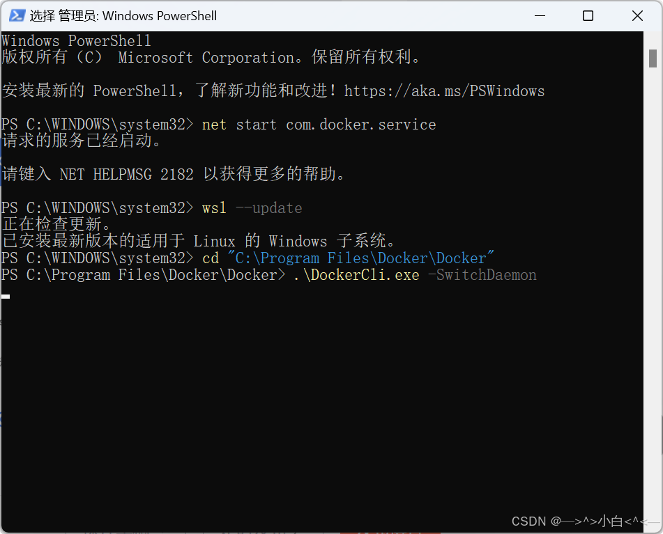 #powershell 管理员身份运行wsl --shutdownStart-Process \"C:\\Program Files\\Docker\\Docker\\Docker Desktop.exe\"