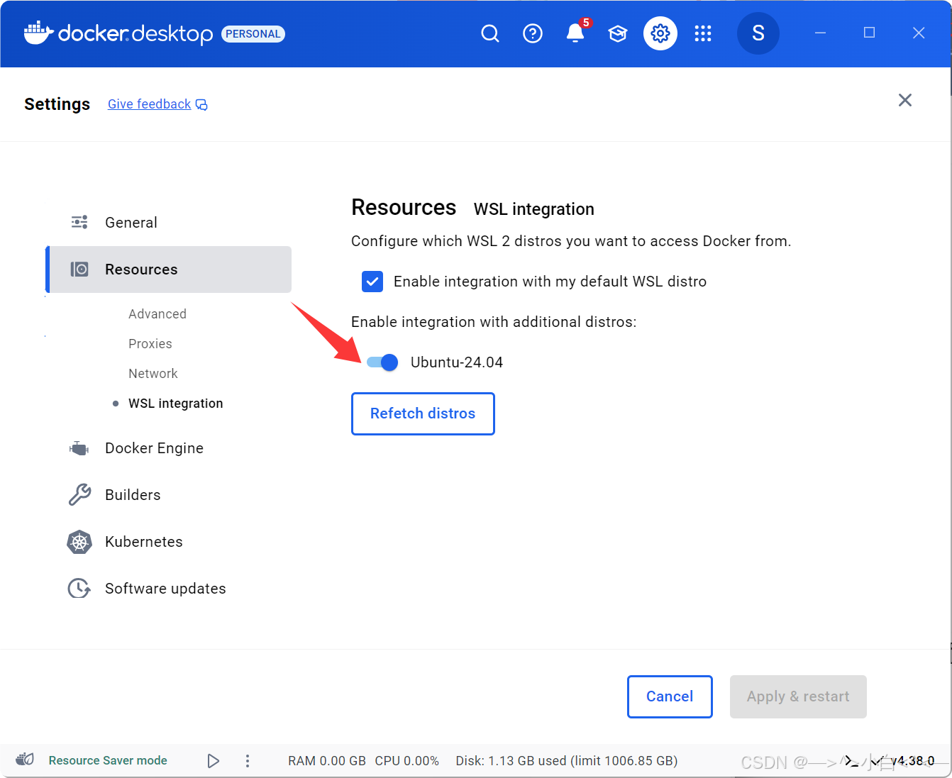 { \"AutoPauseTimeoutSeconds\": 600, \"AutoStart\": true, \"DesktopTerminalEnabled\": true, \"DisplayedOnboarding\": true, \"EnableDockerAI\": false, \"IntegratedWslDistros\": [ \"Ubuntu-24.04\" ], \"LicenseTermsVersion\": 2, \"SettingsVersion\": 41, \"UseContainerdSnapshotter\": true}